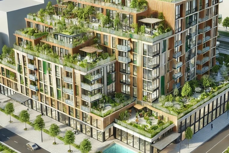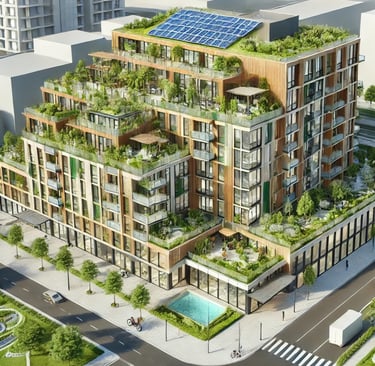 Use of solar panels on the roof and possibly on the facades. - LED lighting and motion sensors. - Double or triple glazed windows to improve thermal insulation. 2. Efficiency in water use - Rainwater collection and reuse systems. - Installation of low consumption faucets and toilets. - Use of rain gardens and artificial wetlands for gray water treatment. 3. Use of ecological materials: - Recycled construction materials or those with a low carbon footprint. - Natural insulation such as sheep wool or recycled cellulose. - Use of wood certified by sustainable seals such as the FSC (Forest Stewardship Council). 4. Passive design: - Orient the building to maximize natural light and reduce the need for heating/cooling. - Use of green walls and roofs to improve insulation and reduce internal temperature. - Incorporation of natural cross ventilation. General distribution of an eco-sustainable building: 1. Ground Floor:-Lobby: Spacious, well lit with natural light. - Green Common Area: Space for common areas with interior plants, recycled wood benches and bicycle parking areas. - Offices/Stores: Flexible, modular spaces, with passive air conditioning systems.